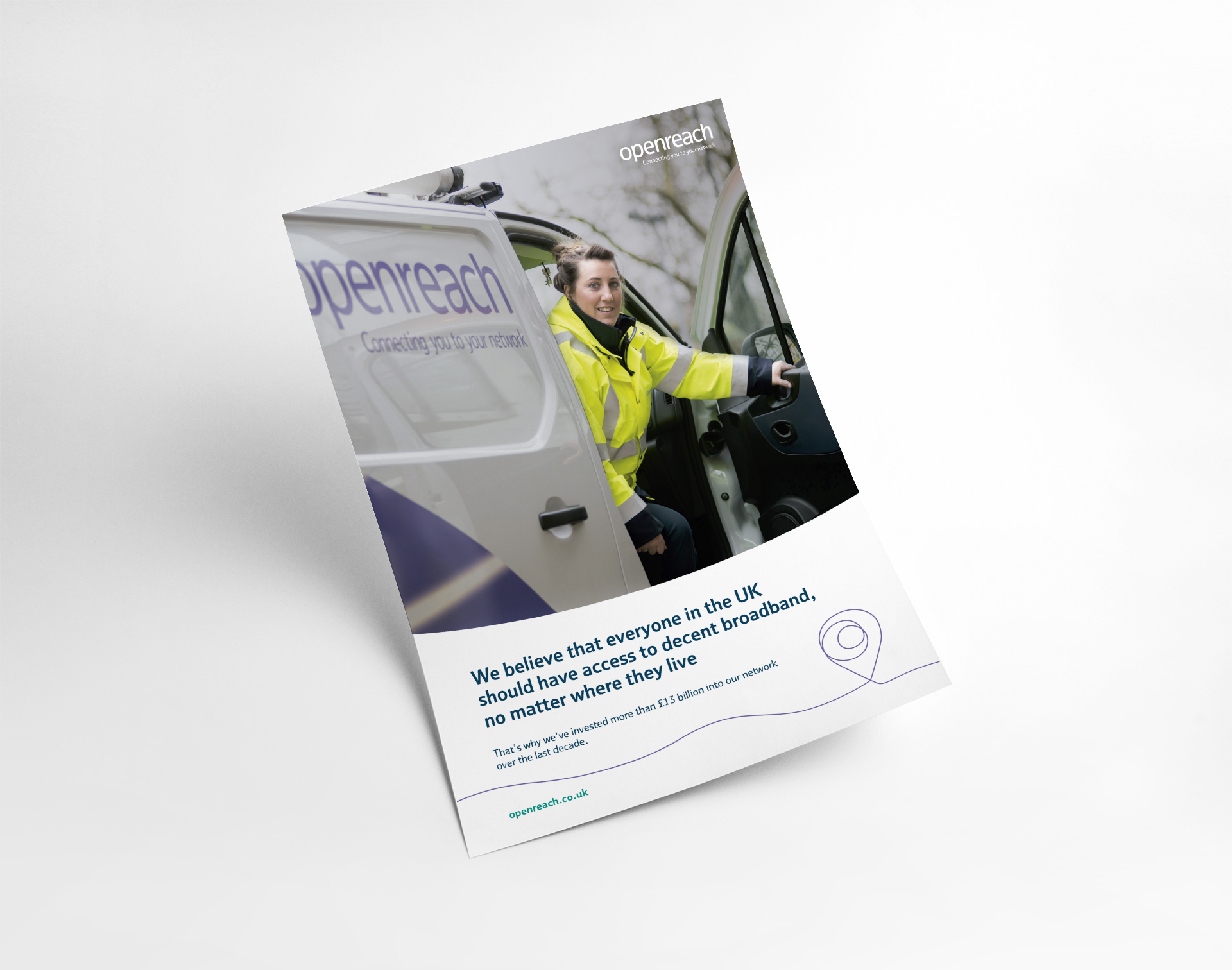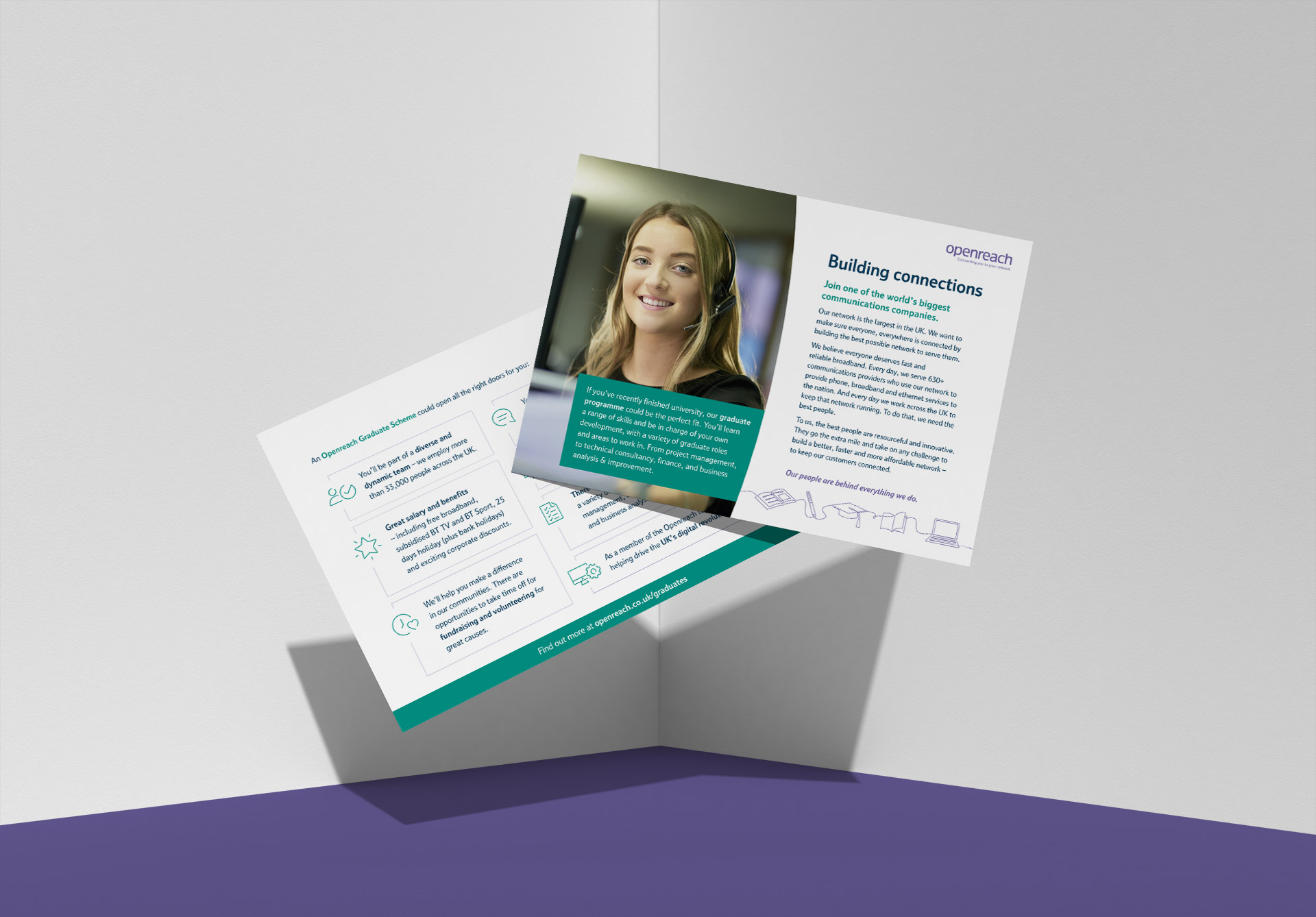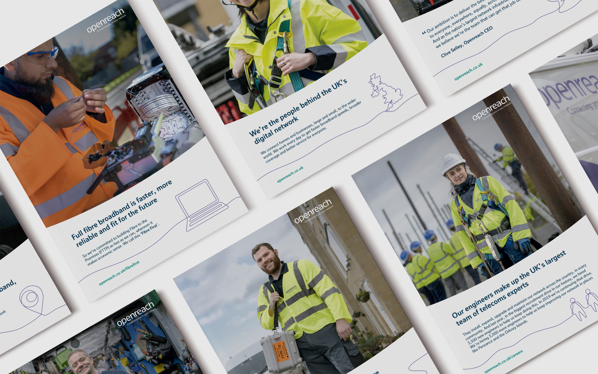 The creative challenge was to promote the brand in order to make people aware that Openreach is a sepparate company from BT. To achieve the goal, some guidelines needed to be defined for internal use, so I designed a tone of voice booklet and social media comms for day to day information. The campaign launched with a selection of print ads in UK and Scotland. Also, to target specific zones, a digital stimulation campaign was realised for a month in selected cities of England. Finally, a graduate scheme campaign was done to attract and recruit new talents via social media and univeristies.