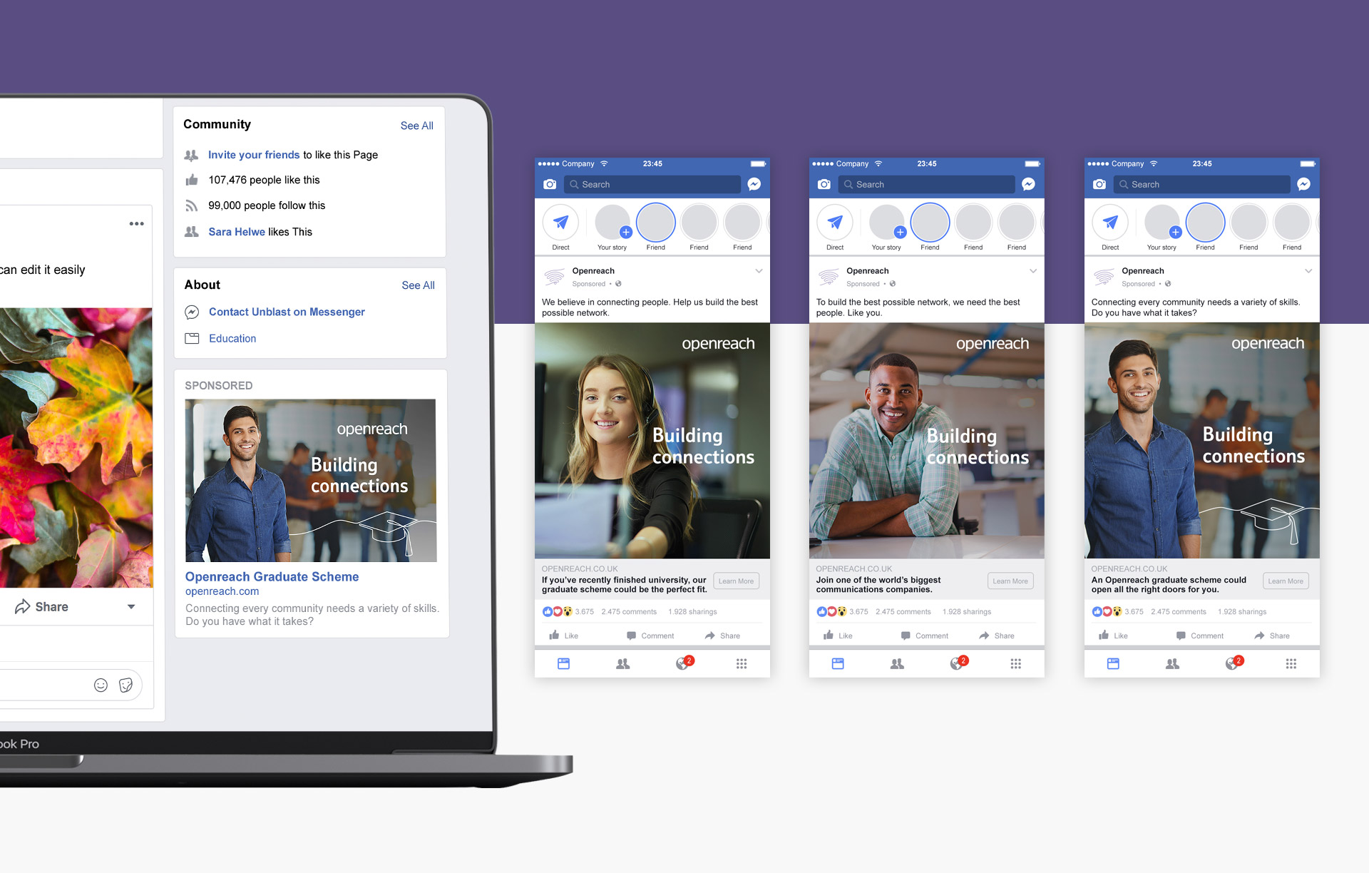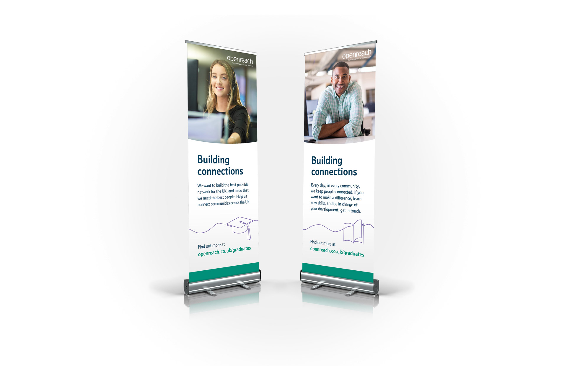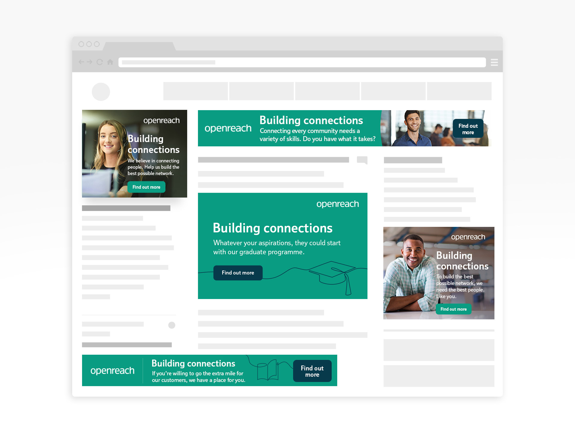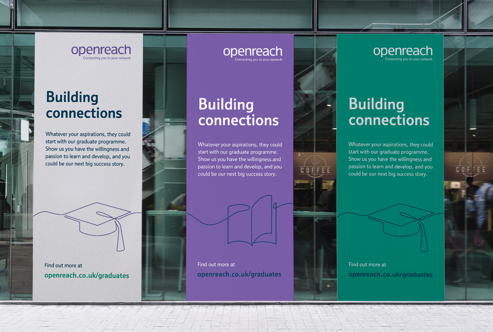 The creative challenge was to promote the brand in order to make people aware that Openreach is a sepparate company from BT. To achieve the goal, some guidelines needed to be defined for internal use, so I designed a tone of voice booklet and social media comms for day to day information. The campaign launched with a selection of print ads in UK and Scotland. Also, to target specific zones, a digital stimulation campaign was realised for a month in selected cities of England. Finally, a graduate scheme campaign was done to attract and recruit new talents via social media and univeristies.